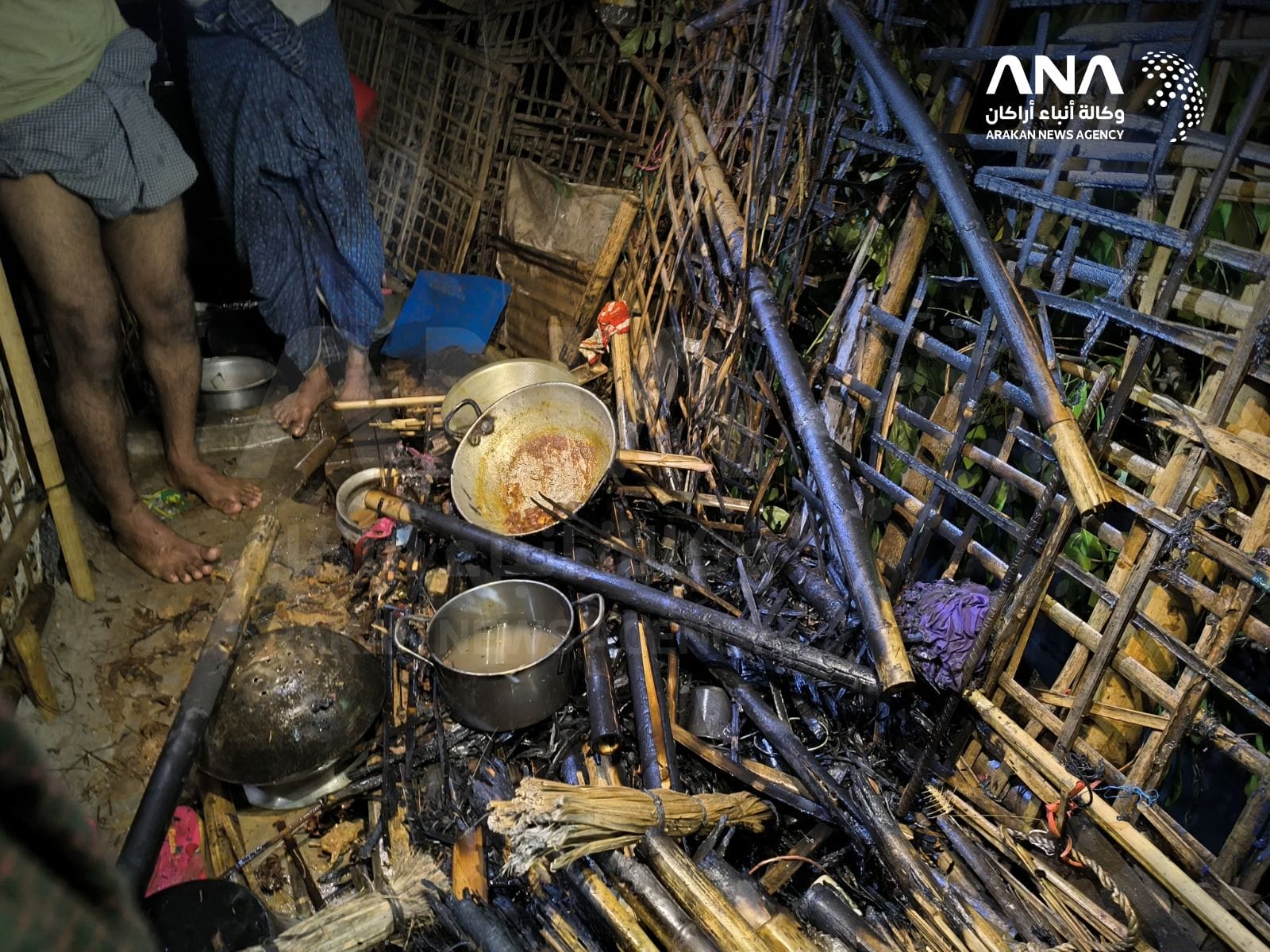 The aftermath of a fire that broke out inside the shelter of a Rohingya refugee in Camp 14 of the Rohingya refugee camps in Cox’s Bazar, caused by the ignition of a wooden stove during cooking. The incident resulted in partial damage to the shelter, with no injuries reported.
