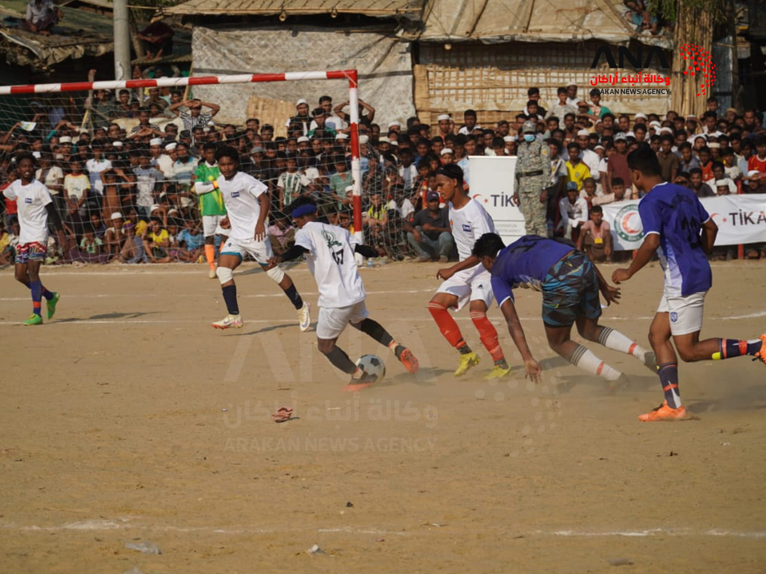 Arakan News Agency Scenes from the kickoff of a Rohingya Football League match in the refugee camps of Bangladesh, showcasing the crowd’s engagement with the players and the game’s events.