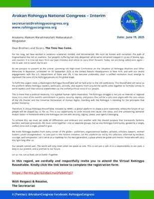 Arakan Rohingya National Congress has called upon Rohingya leaders and activists to join seminar to discuss the Rohingya cause and unite ahead of the United Nations Conference on Rohingya and other Minorities in Myanmar, scheduled on September 30 in New York. The meeting is scheduled on next month via Zoom.