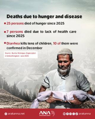 The Myanmar military has besieged Arakan State, blocking the delivery of food and medicine. This has worsened the famine and led to the spread of diseases among civilians, most of whom are Rohingya. As a result, 25 people have died from severe hunger and 7 others from lack of medical care since the beginning of 2025.