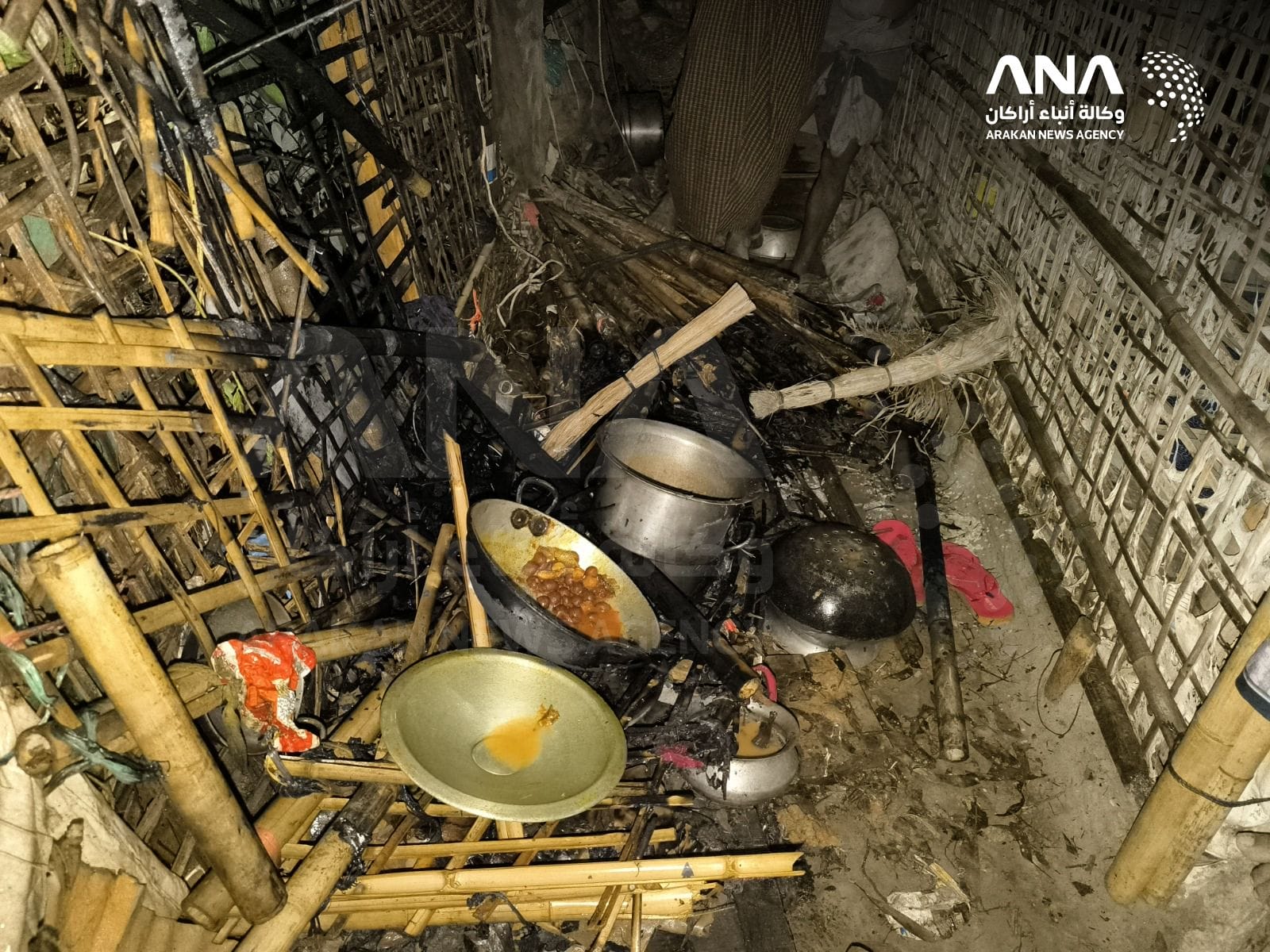 The aftermath of a fire that broke out inside the shelter of a Rohingya refugee in Camp 14 of the Rohingya refugee camps in Cox’s Bazar, caused by the ignition of a wooden stove during cooking. The incident resulted in partial damage to the shelter, with no injuries reported.